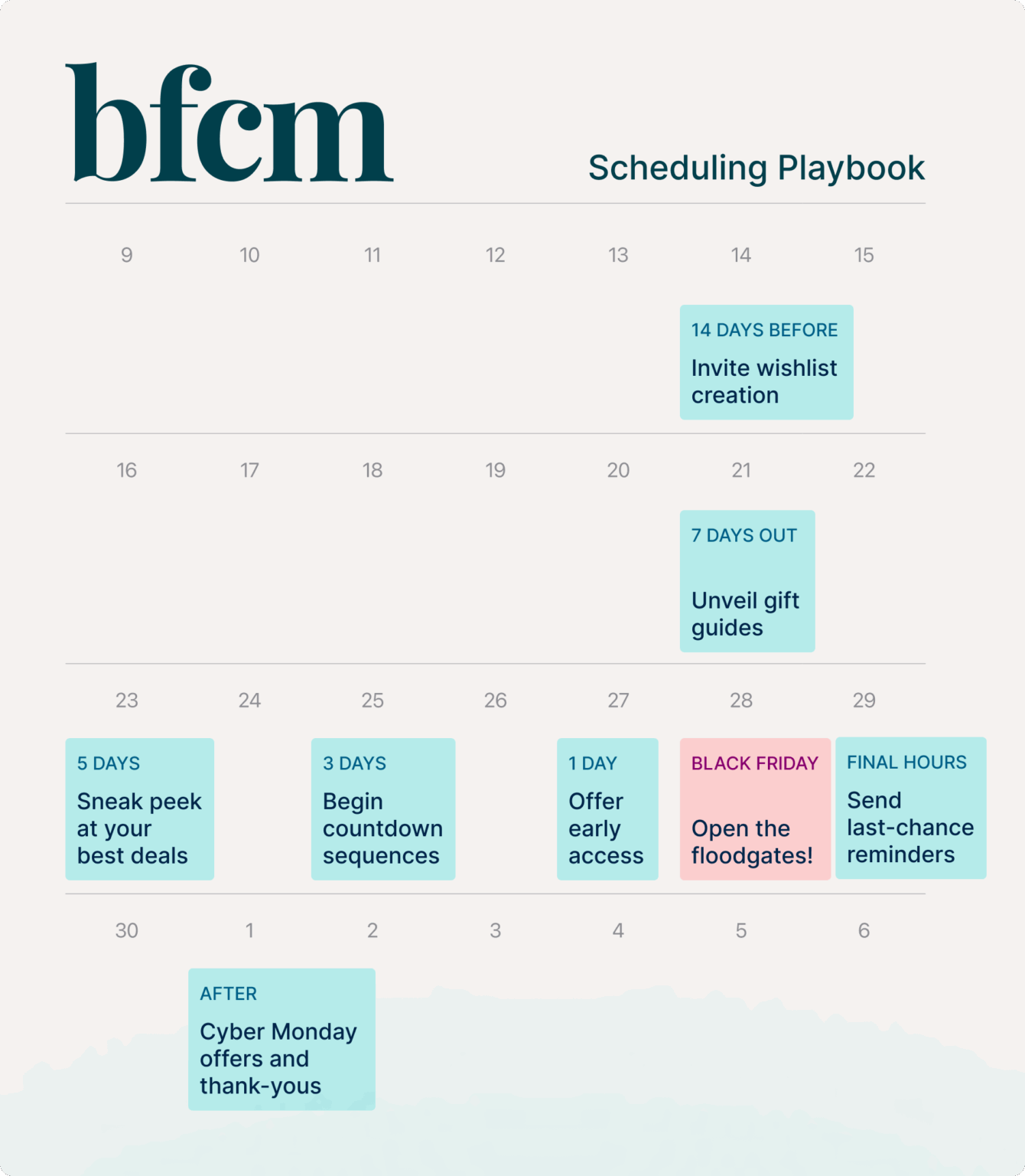 Remember: Deal-hunting starts early! By early November (3 weeks pre-Black Friday) you should already be building anticipation with wishlist prompts, sneak peeks and gift guides. Don’t wait until the inbox is flooded.