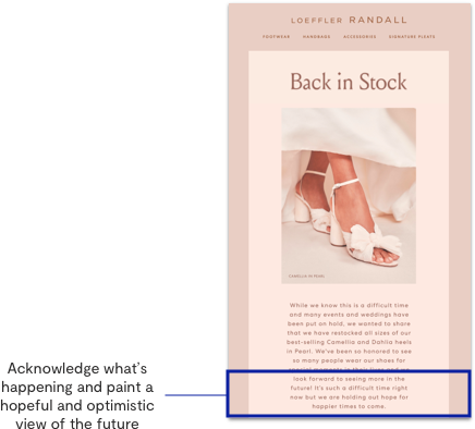 Finally, acknowledge what’s happening and keep your copy measured, but paint a hopeful and optimistic view of the future. Striking this balance helps shoppers understand your intent as a community-focused brand and gives people a reason to stay optimistic by thinking about brighter days ahead.