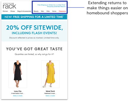 Updating your return policies to accommodate and support store closures and government policies can help ease shopper concerns about missed deadlines. In response to these concerns, many brands are extending return policies, particularly for items that must be returned in store.