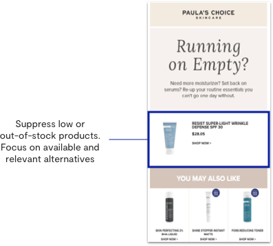 Introducing merchandising triggers that respond to real-time changes in your product catalog can help manage fulfillment and supply issues. As a best practice, you should exclude out-of-stock and low inventory products from recommendations within existing campaigns.