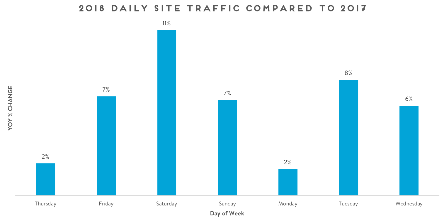 While each day of the week also saw increases in site traffic, these spikes were less pronounced than the increase in revenue. Once again, this finding indicates that retailers were successful at targeting customers to get the right shoppers onsite.