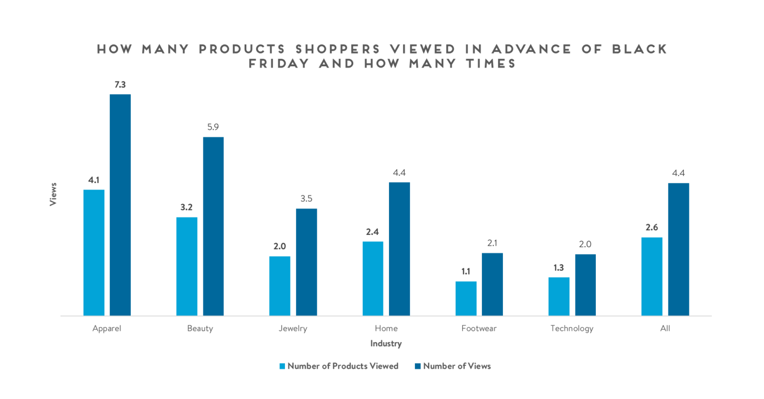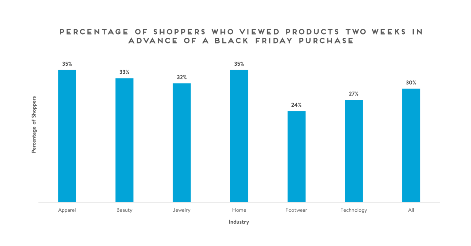 Among Black Friday shoppers, nearly one-third did their research first. Across the board, an average 30% of Black Friday shoppers viewed a product that they bought at least once during the two weeks prior.