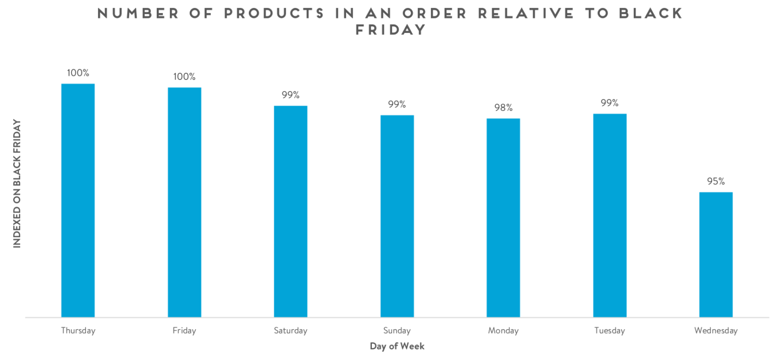And while there was substantial variation in the total number of orders placed throughout the week, the average order value stayed relatively steady. The same holds true for the number of products per order.