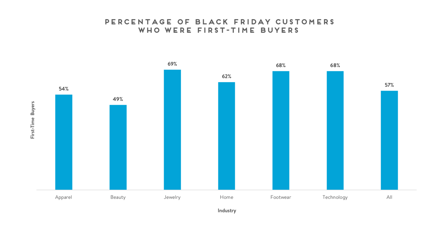 In 2018, an average of 57% of Cyber Week purchases came from first-time buyers.