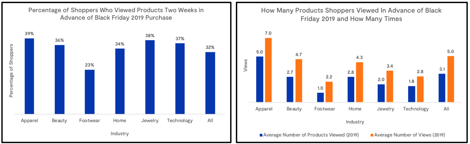 In addition to shoppers spreading purchases throughout the full Cyber Week, they’re also doing more research ahead of time. All retail verticals saw an increase in shoppers viewing products ahead of Black Friday compared to 2018. This trend indicates that not only are Black Friday purchases less likely to be impulse buys, but also that consumers are doing their homework ahead of time to scope out the best possible deals.
