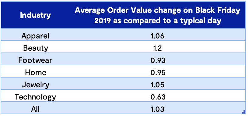 Despite the deep discounts on offer, retailers of all kinds saw an increase in average order values on Black Friday compared to a typical day. Beauty retailers, in particular, saw the biggest increase in order values in 2019. This data indicates that the discounts are encouraging shoppers to buy more than they normally would.
