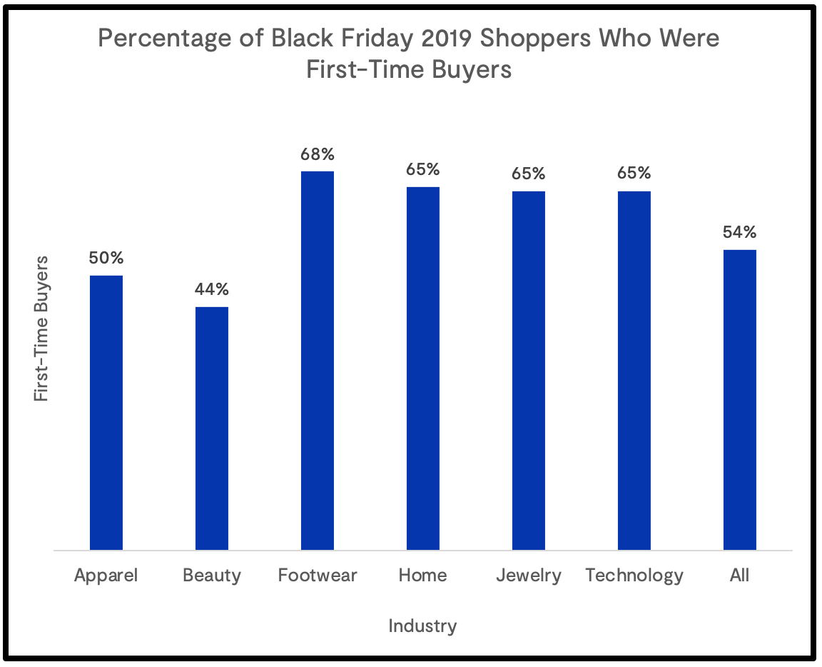 Critically, all of these gains deliver more than just short term benefits to retailers. An average of 54% of Black Friday shoppers were first-time customers for retailers, which presents a mountain of opportunity in the coming months to turn these one-time buyers into repeat purchasers.