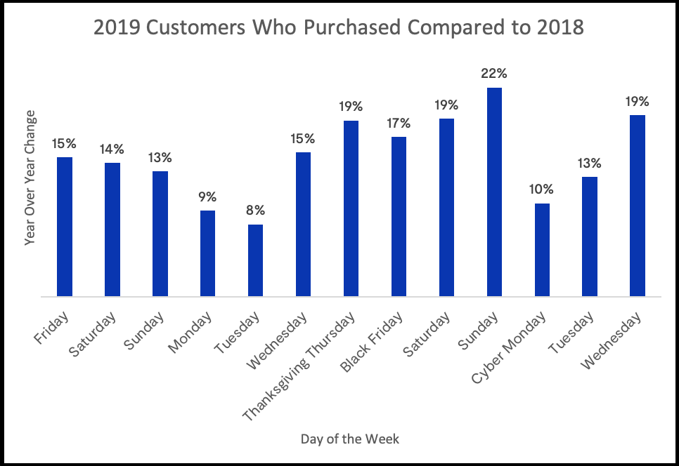 Given the increases in revenue and site traffic each day, it’s not surprising that retailers also saw more purchases from individual customers during Cyber Week 2019 compared to 2018. Under this lens, retailers saw the biggest year over year increase on the Sunday after Thanksgiving and one of the smallest year over year increases on Cyber Monday.