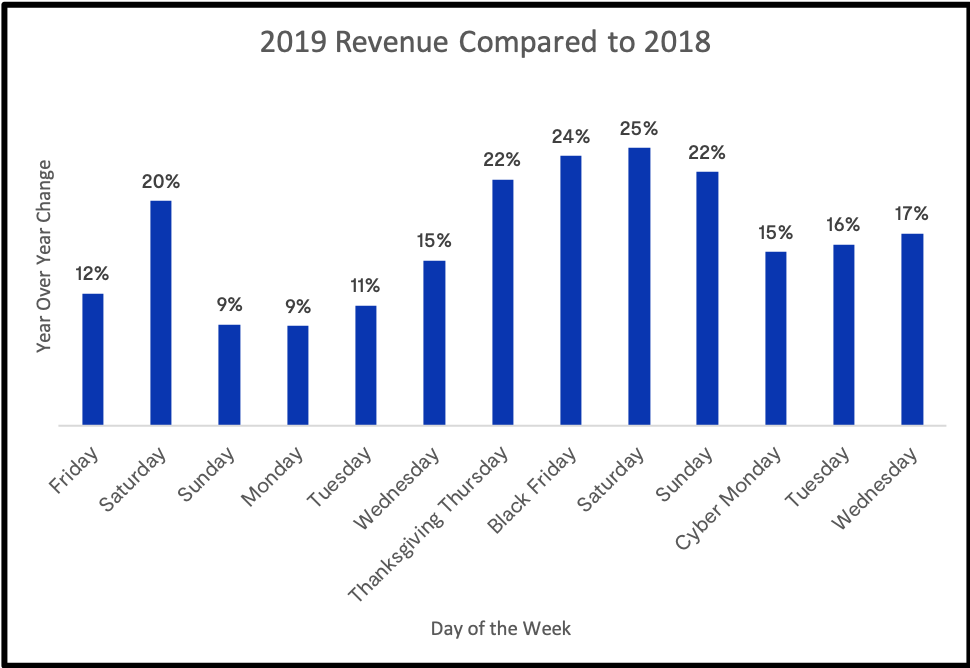 Daily revenue increased between 9-25% throughout Cyber Week 2019 compared to last year. The biggest increases came between Thanksgiving Day and the following Sunday as well as on the Saturday before Thanksgiving.