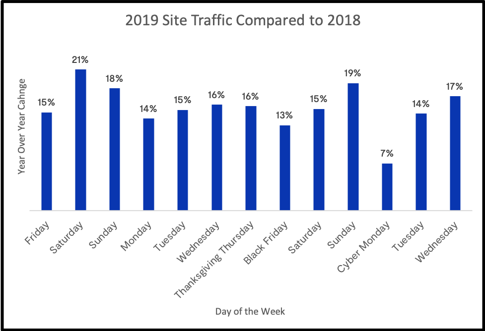 Daily site traffic increased as well compared to Cyber Week 2018. These spikes were more evenly spread out through the week, with consistent increases coming throughout the entire week leading up to Black Friday.