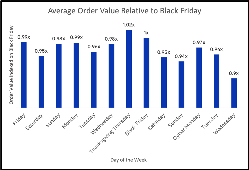 Thanksgiving Day 2019 actually saw the same (and even very slightly higher) average order compared to Black Friday. Additionally, sales on the Sunday and Monday before Thanksgiving brought in average order values on par with Cyber Monday.