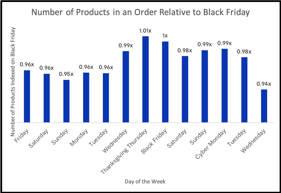 A similar pattern emerges when looking at the number of products in each order. Specifically, Thanksgiving Day falls in line with Black Friday in terms of number of products per order. However, the days immediately after Black Friday saw more products per order than the weekend before Thanksgiving.