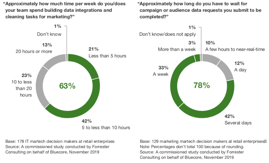 Today’s retail environment operates at a fast pace. Shoppers demand information in real time and make decisions quickly. But marketers struggle to process and action on data in real or near-real time because they don’t have access to it. Most organizations require a centralized resource, usually IT, to handle data management efforts. According to Forrester, “nearly two-thirds of IT respondents working on data integration and cleaning devote at most 10 hours a week to these critical enablement tasks, creating a bottleneck on data insights required to power relevant customer experiences. As a result, marketers struggle to turn data into action.”