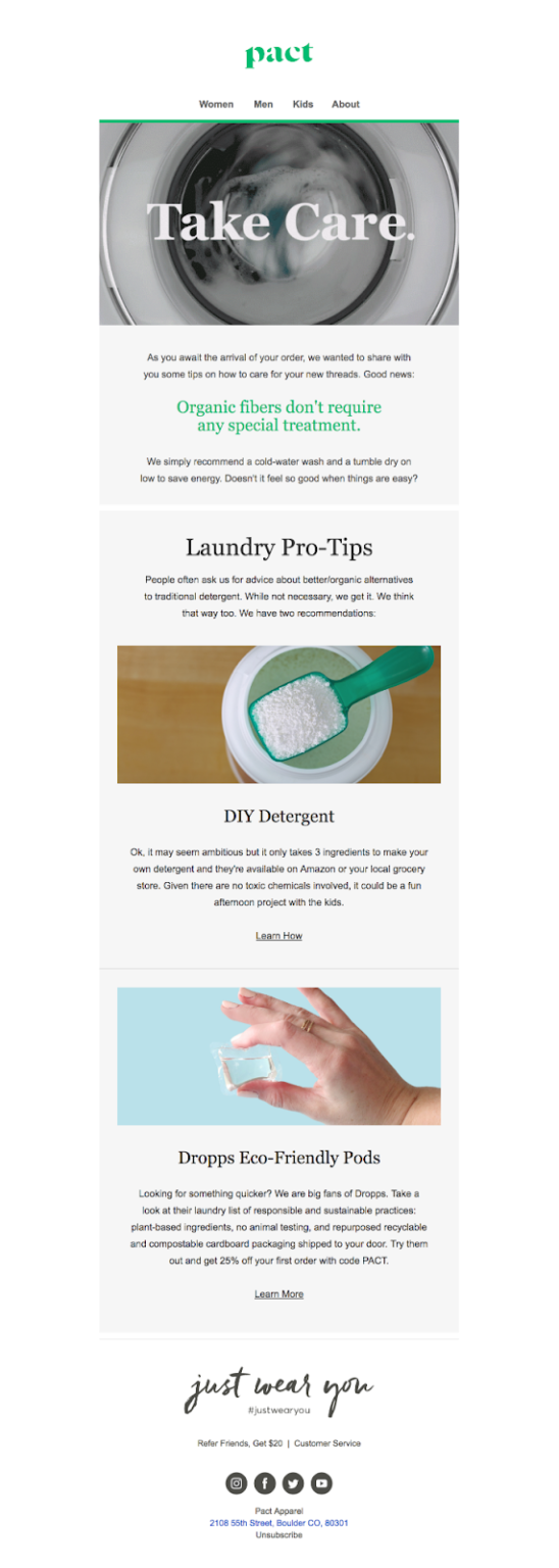Your welcome series is your first opportunity to get in front of shoppers at a truly 1:1 level, and that makes it especially important to show them you’re listening. For example, if I’m a man who was browsing men’s products on your site before I signed up for emails, I certainly don’t want to see an email full of dresses.