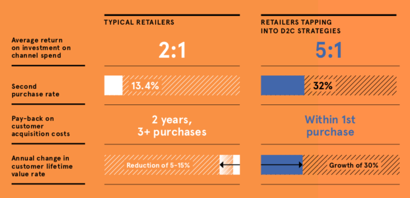 Meanwhile, brands that adjust their strategies and martech to support more agile, customer-centric direct-to-consumer (D2C) marketing strategies see an average 30% growth in annual customer lifetime value (compared to a reduction of 5-15% with the status quo) and a 5:1 return on investment on channel spend.