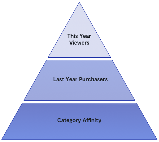 The middle tier — last year purchasers — covers shoppers who purchased during the holiday season last year but have not yet done so this year. You can create a seamless experience for this group of customers by sharing common co-purchase recommendations or next best purchase patterns based on what they bought last year. This approach is especially ideal for customers who only shop from you a few times a year to buy gifts for their friends and family.