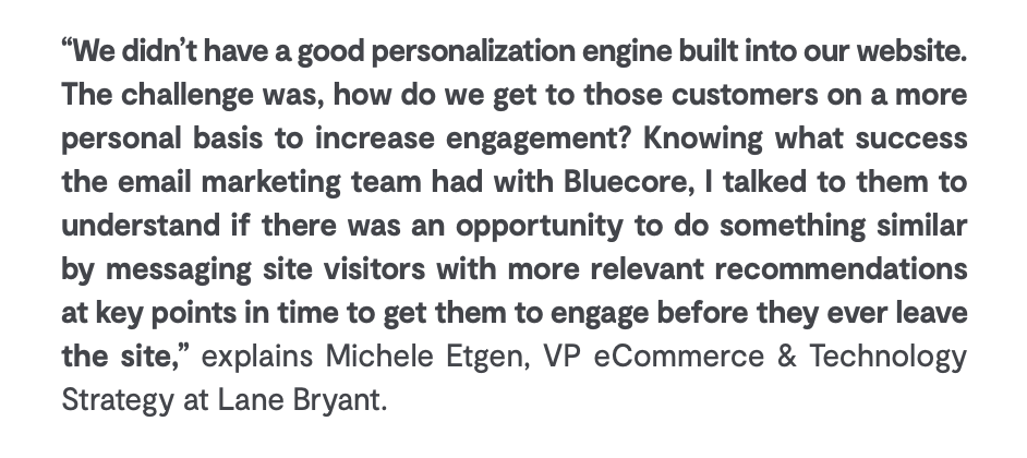 And the brands that capitalized on this shift are the ones now leading the way in ecommerce personalization. Not only does personalization improve customer experience, but it also increases revenue and conversions. For example, during the digital shopping shift, Lane Bryant focused on building its ecommerce presence (and improving customer experience) to offset decreasing in-store revenue. As a result, they saw a 5x increase in revenue, leading to a 63% lift in conversions.
